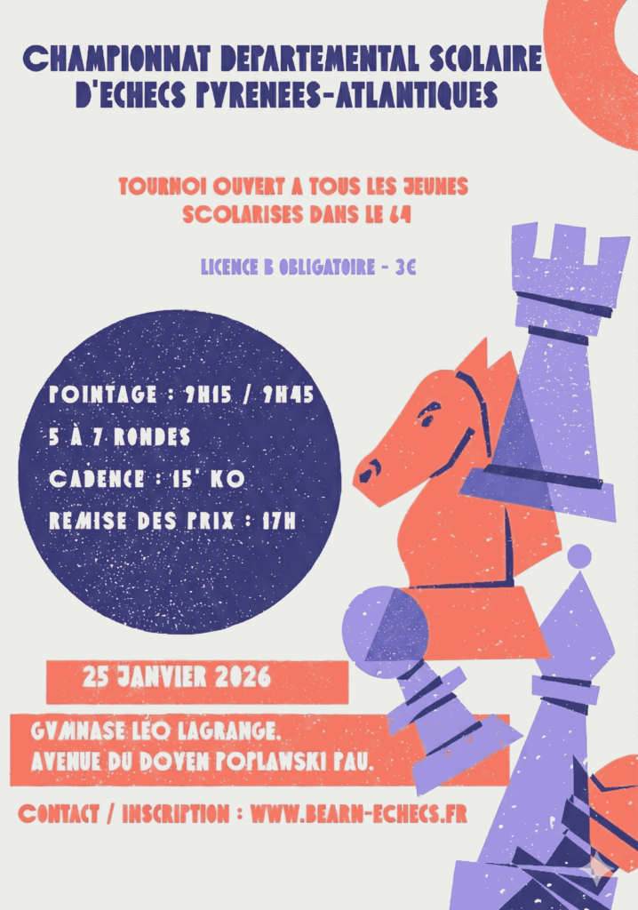 Note : En cas de désistement, nous vous remercions de nous prévenir par mail à bearn.echecs@gmail.com afin de réattribuer la licence offerte à un autre enfant.
